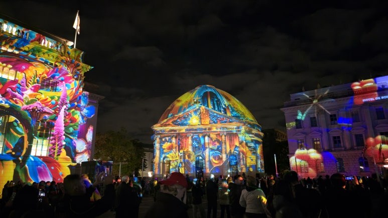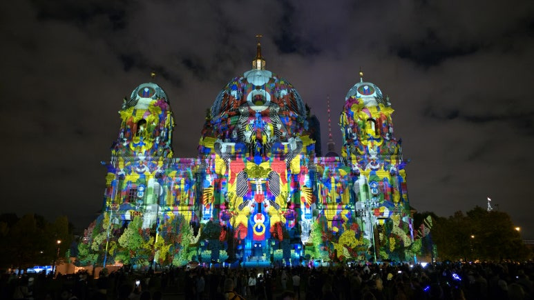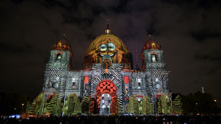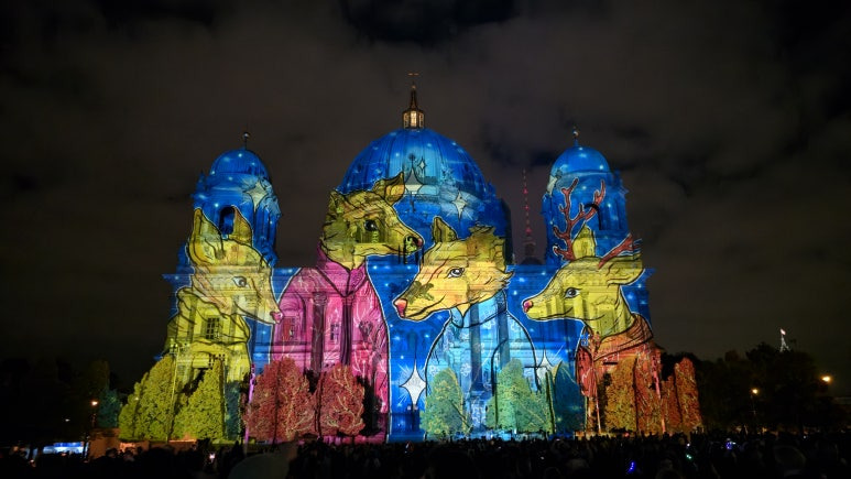 니콜라이 지구를 지나 슈프레강을 건너면 웅장한 베를린 대성당(Berliner Dom)이 등장합니다. 돔의 둥근 지붕 전체에 투사되는 라이트 매핑은 매년 이 축제의 하이라이트 중 하나이죠. 올해는 금빛과 파스텔톤의 색감이 교차하며 돔의 구조미를 극적으로 살려주는 연출이 돋보였습니다. 강가의 루스트가르텐(Lustgarten) 공원 쪽에서 바라보면 대성당의 조명과 슈프레강 위 반사가 함께 어우러져, 사진 한 장만으로도 완벽한 야경이 완성됩니다.