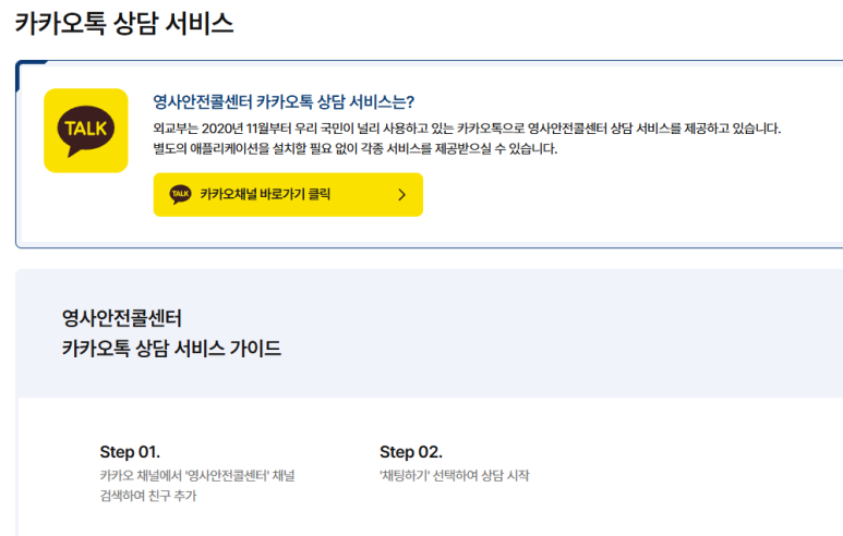 - '외교부 영사콜센터' 채널을 친구 추가하거나, 무료전화 앱에서 '카카오톡 상담 연결하기'를 누르면 끝!