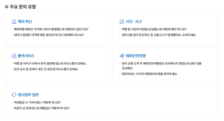 - 여권 및 해외여행 일반 상담: 여권 분실 시 재발급 절차, 입국 허가 요건 등