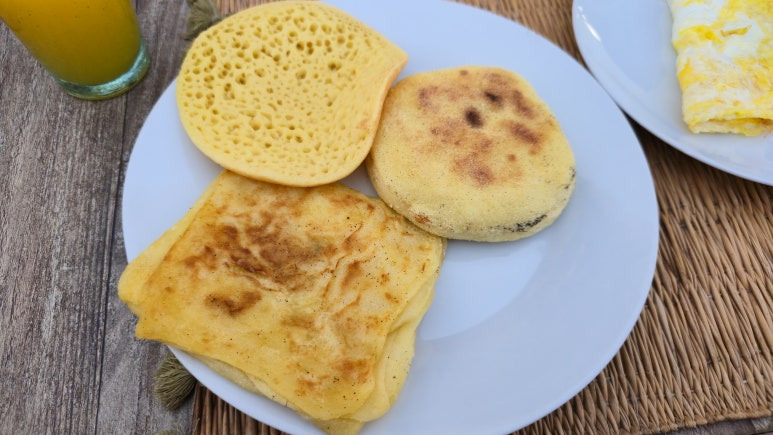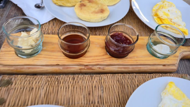 아침은 자리에 앉으면 준비를 해줍니다. 옥수수빵과 모로코식 팬케이크인 므세멘(Msemen)이 나오고 여기에 발라먹을 잼이나 꿀 등을 준비해줍니다. 아침 커피와 이정도 음식이면 조식으로 정말 딱 좋지요. 신선한 과일은 덤입니다.