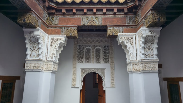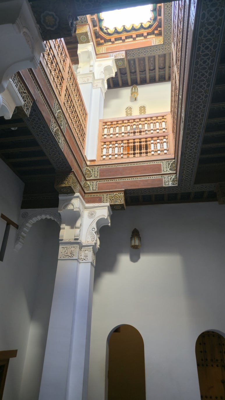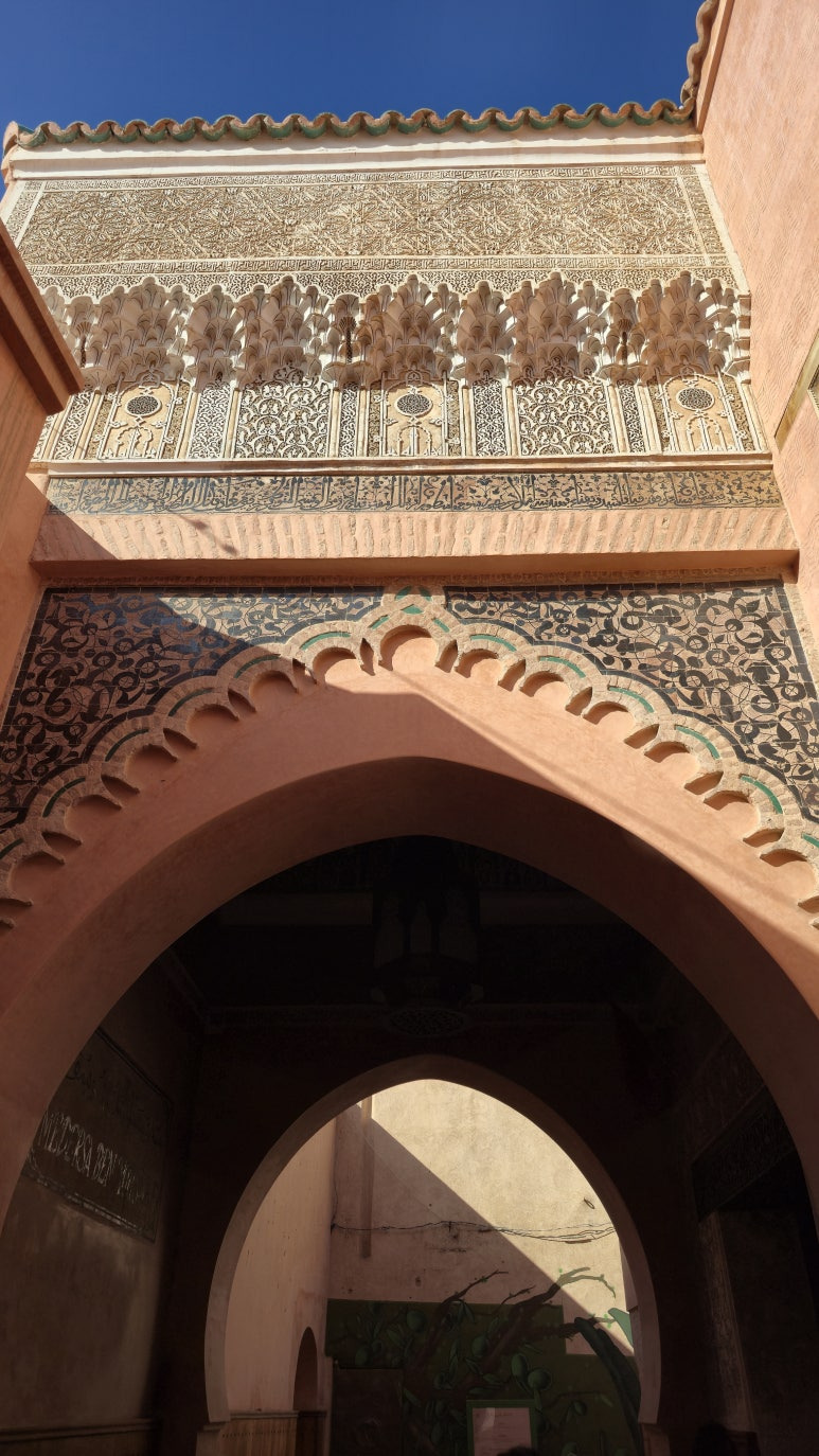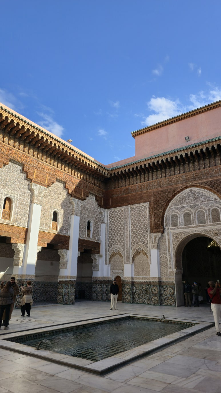 📸 방문 팁을 하나 덧붙이자면! 이곳은 2022년에 긴 복원 공사를 마쳐서, 제가 갔을 때도 타일과 조각의 색감이 정말 선명하고 아름다웠습니다. 다만 마라케시 최고의 핫플레이스답게 낮에는 발 디딜 틈 없이 붐빕니다. 저처럼 연못에 비친 고요한 건축물의 모습을 온전히 사진에 담고, 그 공간의 분위기를 제대로 느끼고 싶으시다면 무조건 이른 아침 '오픈런'을 추천합니다! 마라케시 여행을 준비 중이시라면 이 매혹적인 공간의 디테일을 꼭 직접 눈으로 확인해 보세요.